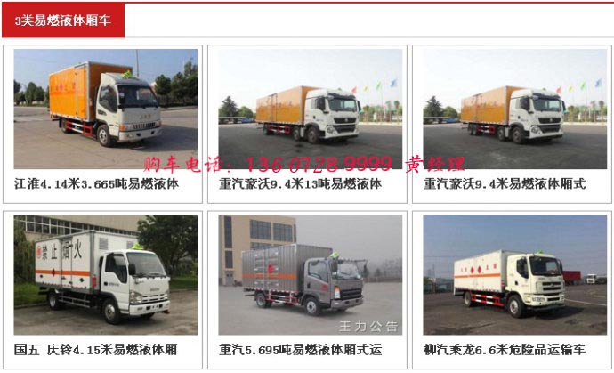 三類易燃液體箱式車:該車主要用于運輸獨立容器包裝的介質:粘合劑,涂料,料溶液,酒精,柴油,汽油,油漆,煤油,機油,苯,甲醇,乙醇,甲醇,丙酮,甲苯,二甲苯.運送危險貨物類項號為:3。