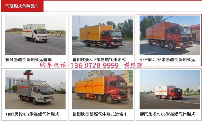 二類易燃氣體箱式車:該車運輸具有獨立容器(瓶)包裝的易燃氣體:液化石油氣、壓縮天然氣、乙炔、乙烷、丙烷、丁烷、異丁烷、丁烯、甲烷、丙烯、環丁烷、丙二烯、甲乙醚、打火機或打火機加油器(裝有易燃氣體)、氫。運送危險品類項號為2.1。