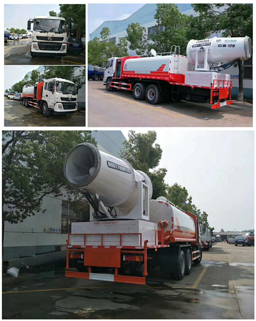 東風國五后雙橋抑塵車上裝基本配置:前沖后灑、側噴、 平臺高炮、自流閥及消防接頭 各1個、水管2根。 標配億豐泵或金龍泵 噴霧機射程:選裝100-120米 有免征環保。東風國五后雙橋抑塵車圖片展示:
