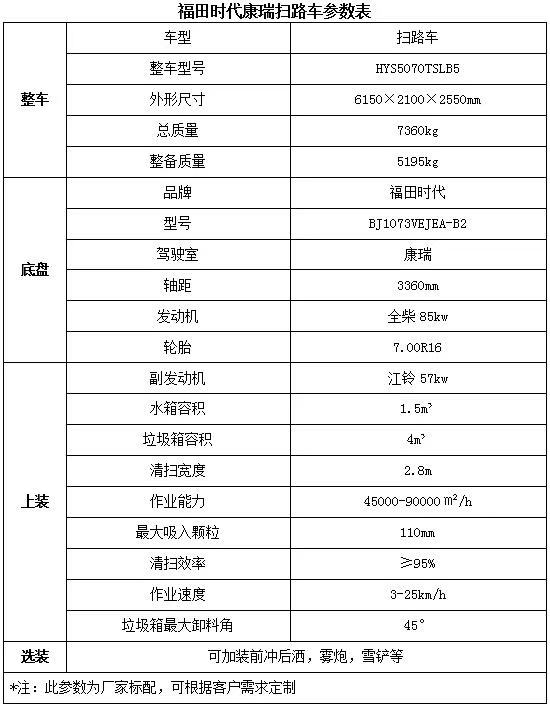 福田時代康瑞H2掃路車底盤采用時代康瑞H2,3360軸距,全柴112馬力發動機,氣剎,動轉,ABS,7.00R16鋼絲胎,福田時代康瑞H2掃路車上裝配置參考:匹配江鈴57千瓦副發動機,中置4掃盤、三洋馬達、江鈴副發動機、施耐德控制開關、海普瑞斯電磁閥組、無級變速自動離合器、免維護離心式風機、不銹鋼垃圾箱、北極星電子水泵、垃圾箱舉升自卸、尾部LED箭頭燈、手動泵應急系統,選裝配置:前沖后灑為選裝配置,垃圾箱自潔功能卷盤水槍為選裝配置,倒車影像作業監控為選裝配置,價格另計。