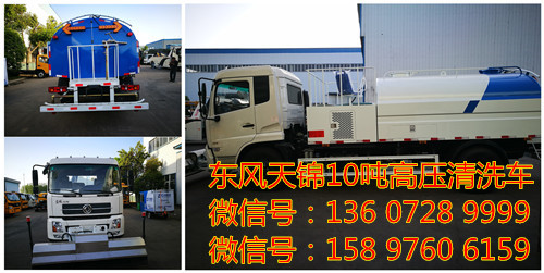 東風天錦10噸高壓清洗車上裝配置: 高壓清洗配置:匹配江鈴型號JX493(57KW)78馬力副發動機,意大利HPP大流量進口高壓泵,前置清洗架(21個進口噴咀),駕駛室電控操作,清洗架可上下左右30°擺動,臺灣合資液壓系統,高低壓灑水功能,其它標配。