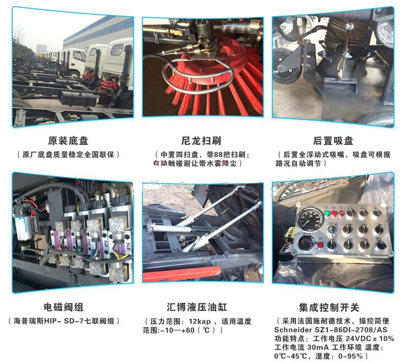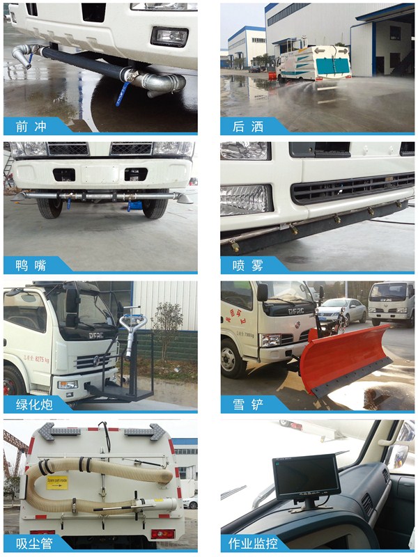 國五東風天錦掃路車底盤配置:東風天錦清掃車,采用中日合資的東風天錦系列環衛車專用底盤,配平頭一排半豪華駕駛室,發動機選用中美合資的康明斯系列柴油發動機,配合東風6檔變速箱,好開易上手。4.5噸前橋,9噸單級減震后橋,9.00鋼絲胎,大大提升了負載能力。原廠空調、ABS、斷氣剎,提升了司機駕駛的舒適性和安全性。