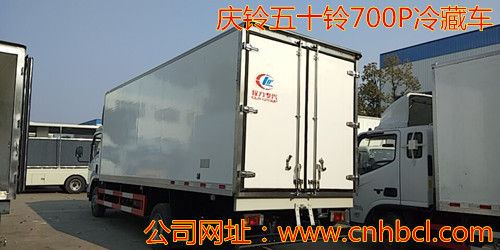 國五慶鈴五十鈴700P冷藏車廂體配置:冷藏車廂體尺寸:5900×2035×1995 mm,整車尺寸:8045×2245×3330 mm,冷藏廂體采用內外飾玻璃鋼;中間夾層保溫材料采用聚氨酯切片真空負壓一次復合成型;厚度8cm, 符合國家衛生部頒布食品等級要求,雙后開門門框架全部采用玻璃鋼制成的整體框架,雙后門中縫帶斜度,開關方便。門邊框密封采用進口優質橡膠(三元乙丙)密封條進行密封,保證廂體保溫效果的穩定性,門邊,門鎖及附件均為不銹鋼制作,不開側門。匹配國產漢雪非獨立機組型號L-Z50,制冷溫度達到-15度,駕駛室內可隨意調節。