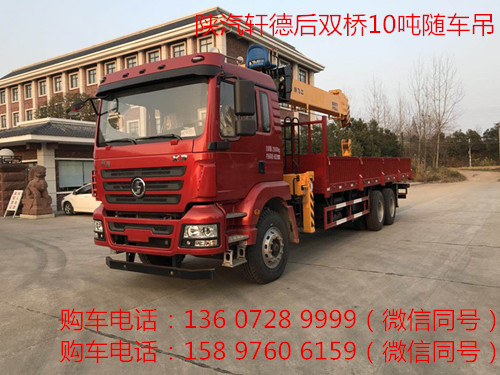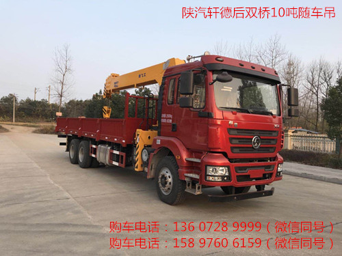 陜汽軒德后雙橋10噸隨車吊整車型號:陜汽牌SX5251JSQGP5型隨車起重運輸車,底盤型號:SX1250GP5,廂體尺寸:8400×2400×550mm,整車尺寸:12000×2550×3850mm,整備質量kg:15700,總質量:15700,底盤采用軒德X6半浮駕駛室,法士特9檔變速箱,5800+1300mm軸距,5噸前橋、10噸后橋,原裝空調,氣囊座椅,200L油箱,300*(8+6+8)局部三層(外包梁),11.00R20輪胎。