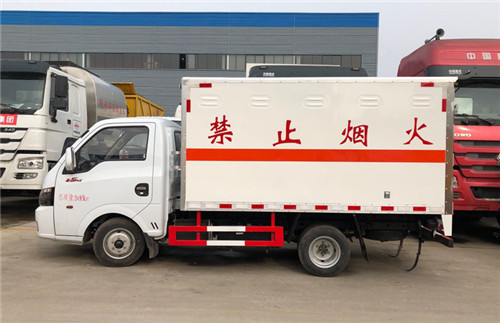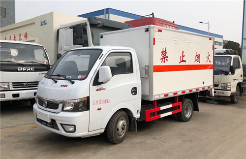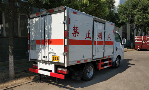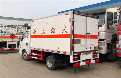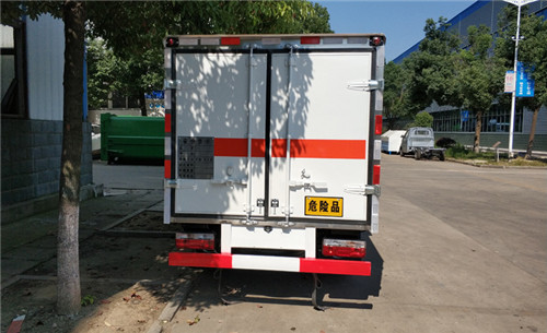 東風途逸9類雜項危險品運輸車整車尺寸(mm):5100,4700×1780,1730×2190,2250,箱體尺寸(mm):3000,2600×1630×1400 ,箱體采用拼裝結構,外厚度為1.5毫米厚度武鋼冷軋鋼板,中鋼骨架,內壁為鋁合金板,箱體厚度為5公分,箱體外表上方采用模壓成型帶防水通風功能百葉窗,固定貨物的臥式拉環鉚接在鋼骨架上,牢固可靠。門內安裝高精度限位裝置和駕駛室內部報警器相連接,杜絕箱門未鎖緊情況。箱體外部箱門打開處安裝防自關門的限位風勾,箱體外觀涂裝灰色油漆,駕駛室內部安裝安全報警器連接后部箱體,對箱體內部實施安全監控。