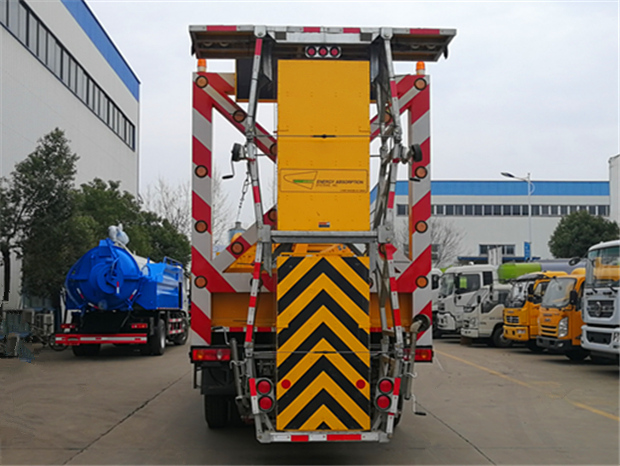 東風天錦防撞緩沖車上裝技術參數:防撞緩沖車的防撞緩沖吸能模塊主要由車載防撞緩沖墊和導向標志架組成,充當施工作業車輛后方的緩沖衛士。如若發生追尾事故,能夠在肇事車輛和前方施工作業區域之間構建一個緩沖區域,通過機具結構變形吸收撞擊的能量,最大限度地降低被保護人員及設備遭到碰撞的幾率。