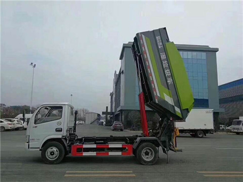 東風多利卡D6自裝卸式垃圾車,濕垃圾運輸車基本配置:箱體外形為后部大傾角側面下圓弧設計,后部掛桶翻轉,雙桶配置,帶滑板刮板,帶污水箱,整車液壓系統采用瀘州眾大品牌油缸,2組多路閥,高壓齒輪泵,優質高壓油管等主要液壓配件,整車電控采用武橋重工高性能控制器,7寸觸控彩屏,旋鈕開關等 主要電控配件。