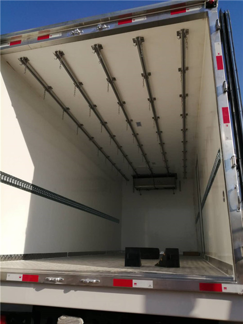 不超重東風(fēng)天錦肉鉤冷藏車廂體采用內(nèi)外飾玻璃鋼,中間夾層保溫材料采用聚氨酯切片真空負壓一次復(fù)合成型,厚度8cm,符合國家衛(wèi)生部頒布食品等級要求,雙后開門門框架全部采用玻璃鋼制成的整體框架,雙后門中縫帶斜度,開關(guān)方便。門邊框密封采用進口優(yōu)質(zhì)橡膠(三元乙丙)密封條進行密封,保證廂體保溫效果的穩(wěn)定性,門邊,門鎖及附件均為不銹鋼制作,不開側(cè)門,廂體底板鋁合金防滑花紋板,不帶底盤板風(fēng)槽,廂體頂部5排普通肉鉤導(dǎo)軌,廂體加固,制冷機組L-Z60,制冷溫度達到-15度,駕駛室內(nèi)可隨意調(diào)節(jié)。