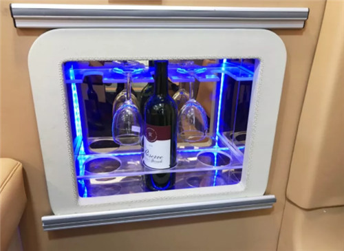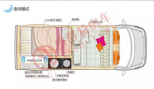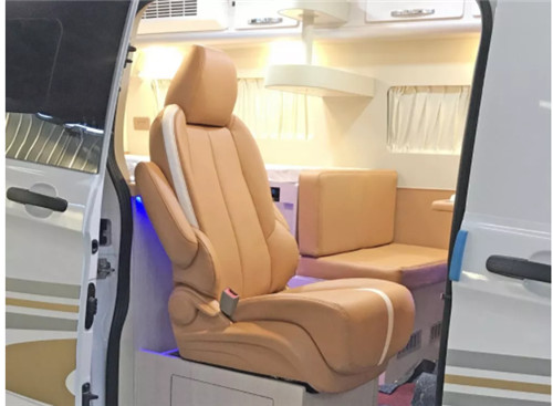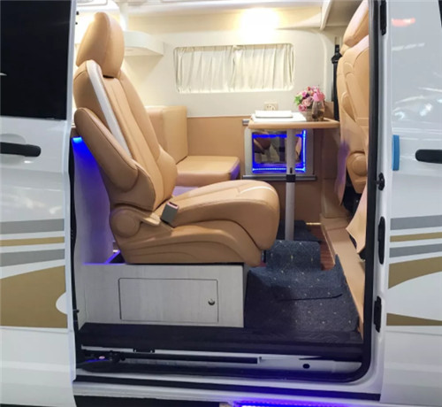 打開(kāi)側(cè)門,電動(dòng)伸縮踏板自動(dòng)伸出,方便乘客上下,進(jìn)入車門是一個(gè)單座,座椅下是個(gè)儲(chǔ)物箱,抽拉式燃?xì)庠畋阍O(shè)計(jì)在這個(gè)地方,也可選裝航空座椅,進(jìn)入車內(nèi)是一個(gè)小客廳,面前是一個(gè)雙人座椅和一個(gè)升降餐桌,主、副座椅均可360度旋轉(zhuǎn),形成一個(gè)對(duì)座,使整個(gè)休閑空間能滿足5-6個(gè)人輕松休閑出游的需求;最為有特點(diǎn)的是兩排對(duì)置的座椅加上高度可調(diào)節(jié)的餐桌不僅可滿足娛樂(lè)等功能,還可將餐桌降下與座椅齊平組成一張可供兩人休息的床鋪。驚喜的是,升降餐桌下面安裝了一個(gè)車載紅酒柜,給豐富的旅居生活增添不一樣的風(fēng)情。