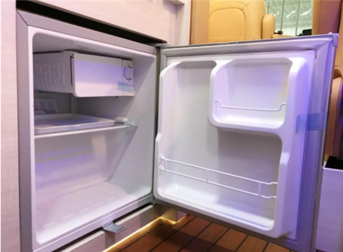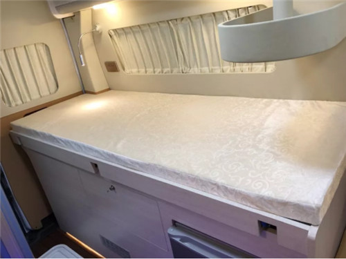 多功能料理臺(tái)對(duì)面的是0.9米寬的舒適單人床,床上鋪設(shè)一塊花紋布套包覆的整塊海綿,夜間可從左側(cè)拉出擴(kuò)展部分達(dá)到1.3m,提供兩人標(biāo)準(zhǔn)就寢空間,舒適愜意的旅居行程在此得到充分展現(xiàn)。床鋪下是一臺(tái)50L冰箱,可存放蔬菜、瓜果、飲料等食物,為用戶的旅居生活增添光彩。床鋪前部上方是一個(gè)雙層置物架,旅居生活所需的一些小物件均可放置其中,不用擔(dān)心因路況顛簸而被抖出。