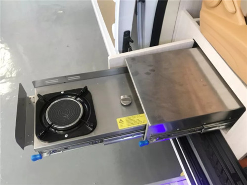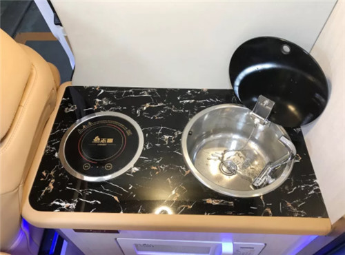 客廳后面進(jìn)入房車餐廚區(qū),映入眼簾的是長(zhǎng)72cm×寬43cm的多功能料理臺(tái),料理臺(tái)左邊是志高電磁爐,與灶臺(tái)水平一致,是灶臺(tái)不可缺少的一部分,雖然不像家用電磁爐功率那么大,但是簡(jiǎn)單的煮粥、煮面、燒水、煮咖啡還是可以的。料理臺(tái)右邊配備帶蓋折疊式水龍頭的洗菜池,不用水時(shí),把水龍頭折疊起來(lái),并把蓋放下,使整個(gè)灶臺(tái)顯得寬敞許多,洗菜池污水可直接排入污水箱。料理臺(tái)下是大宇牌微型微波爐,簡(jiǎn)單的加熱飯菜、牛奶和解冷食品等,非常方便。乘客艙車門入口處的單人座椅下是外置抽拉燃?xì)庠睿B接內(nèi)置液化燃?xì)夤蓿蜷_(kāi)柜門后輕松拉出抽拉式燃?xì)庠睿蜷_(kāi)燃?xì)庠钌w板放上鍋具即可點(diǎn)火烹調(diào),即使在郊外游玩也可以隨便炒幾個(gè)小菜,也可品嘗到家鄉(xiāng)的味道。整個(gè)餐廚區(qū)功能齊全,還配有煙霧報(bào)警器、一氧化碳報(bào)警器,盡量還原家居烹飪環(huán)境,創(chuàng)造安全烹飪條件,讓用戶盡享美味烹飪時(shí)光。