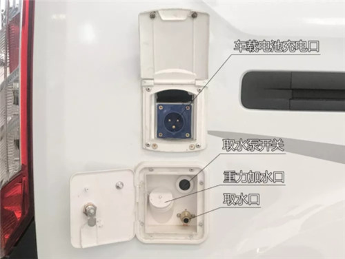 為提供旅居生活的續(xù)航能力,車身左側(cè)后部設(shè)有加水取水集成口和車載電池充電接口,加水取水集成口設(shè)有一個(gè)重力加水口和一個(gè)用開(kāi)關(guān)控制的取水泵口,接口處安裝有專用外蓋防水,細(xì)節(jié)處體現(xiàn)專業(yè)。