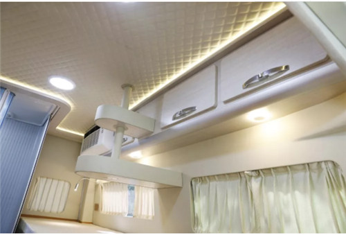 車內(nèi)布局安排合理,有限的空間也顯得寬闊。車內(nèi)KME駐車?yán)渑照{(diào)內(nèi)機(jī)安裝于乘客艙后端左側(cè)頂部,基本上可以滿足整車的換氣需求。可以在這里辦公、用餐、打牌等等。